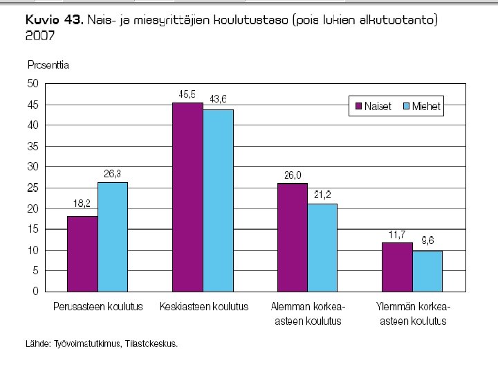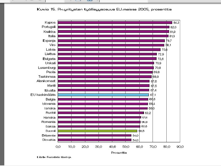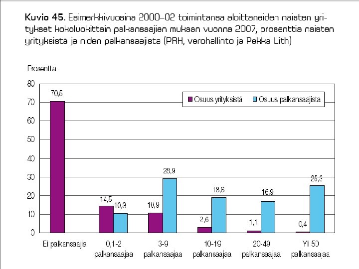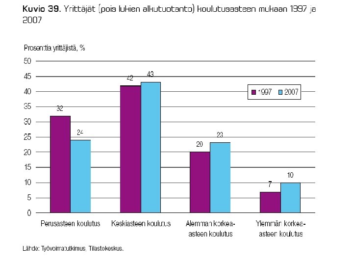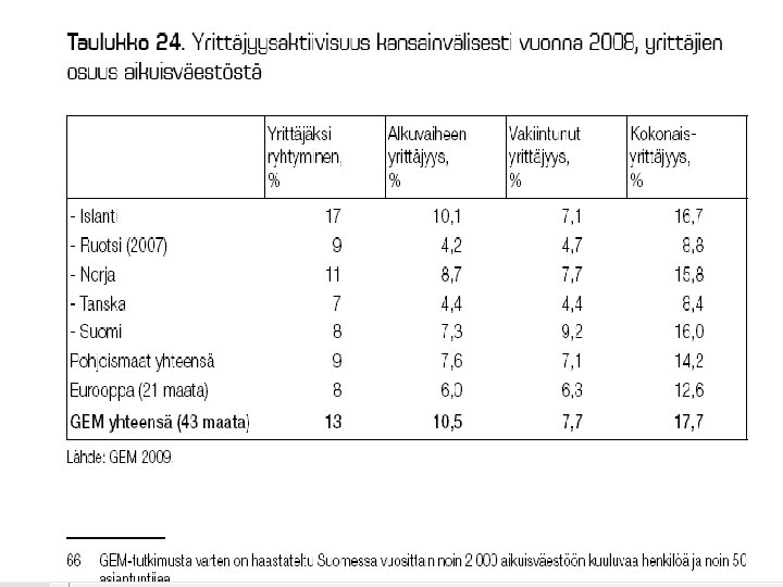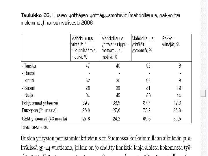 MATALAAN YRITTÄJYYSASTEESEEN SUOMESSA VAIKUTTAA § vahva julkinen sektori § vahvat työmarkkinajärjestöt § heikosti toimivat oman pääoman markkinat § verotus (myös “piilevä”) § vain taantumassa työttömyys voi aiheuttaa “pakkoyrittäjyyttä”, jos ei työllisty muuten § yrittäjyyskulttuuriset kysymykset § valtionjohtoisten suuryritysten pitkät perinteet § niukasti roolimalleja § “häpeämentaliteetti” –konkurssin pelko § yrittäjän palkansaajaa suuremmat riskit 32