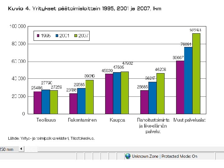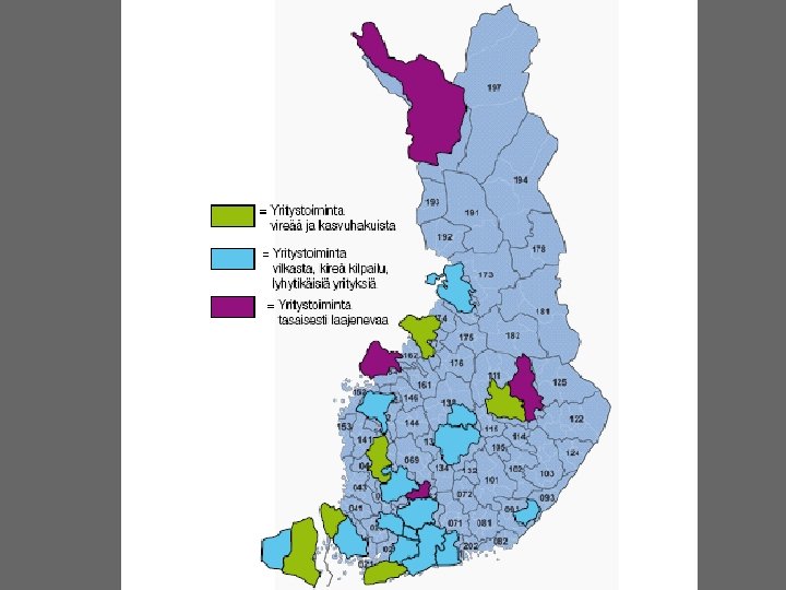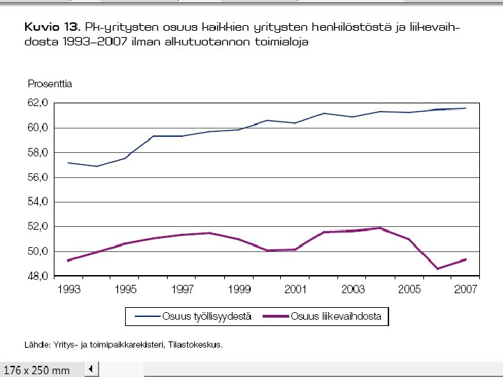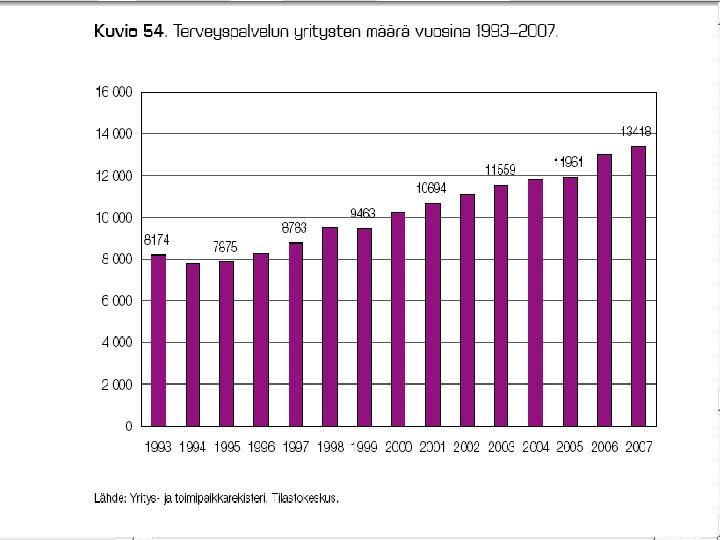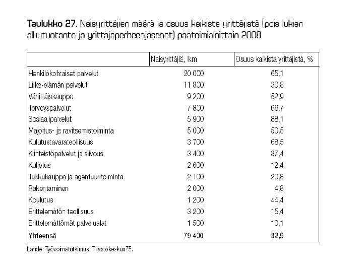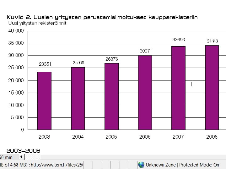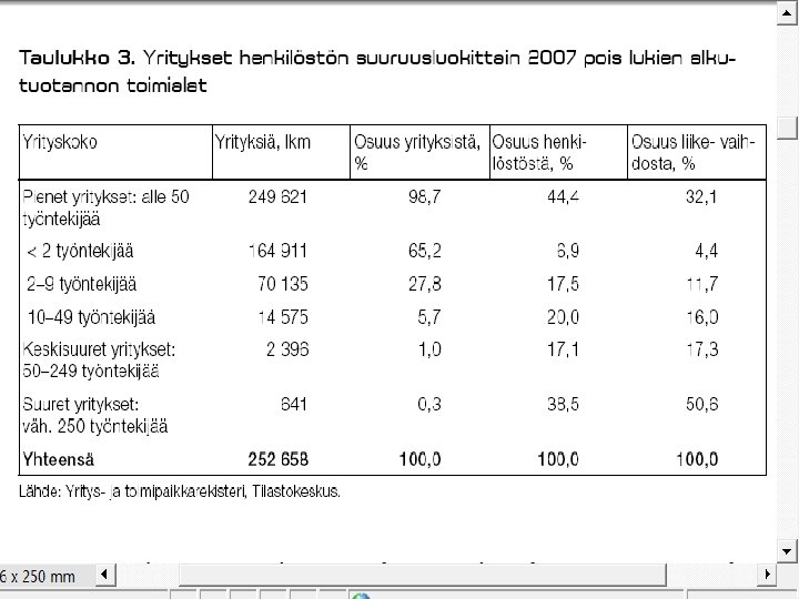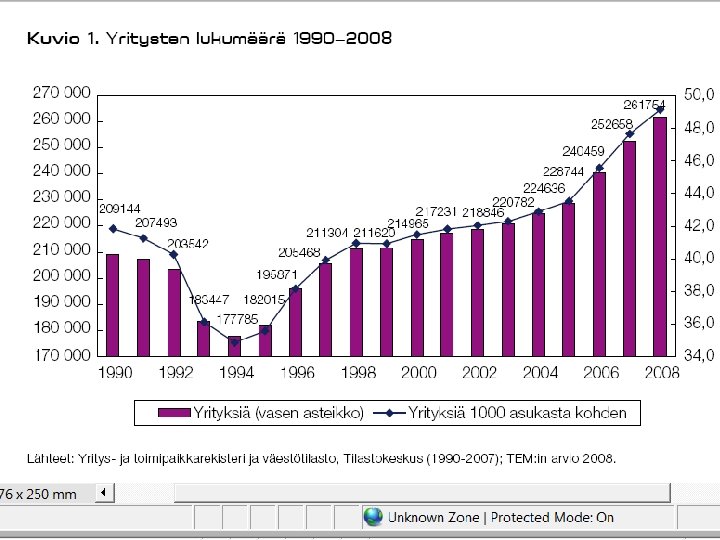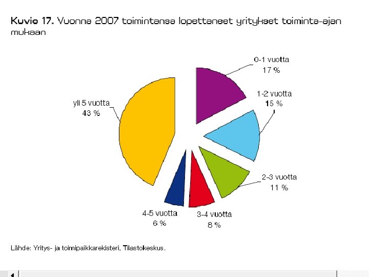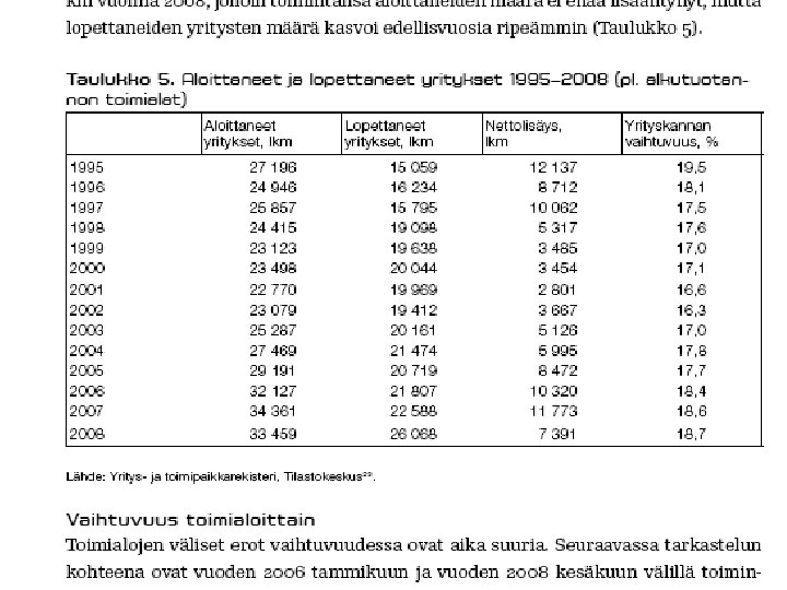 JOITAKIN FAKTOJA YRITYSKANNASTA • Suomessa oli v. 2008 lopussa kaikkiaan n. 260 000 yritystä (ml. maatilat n. 325 000 ). – kaikista yrityksistä n 94 % on mikroyrityksiä (työllistävät 1 - 9 henkeä), pl. maatilat – noin 10 % on pieniä ja keskisuuria (10 - 250 henkeä), pl. maatilat – loput suuryrityksiä • • PK-yritykset työllistävät 61 % yksityisestä työvoimasta ja jo pitkän aikaa uusia työpaikkoja syntyy enemmän niissä. Esim. huippuvuonna 2007 aloitti 33693 uutta yritystä ja suhdanteista riippuen n. 20 – 25 000 lopettaa vuosittain. vaihtuvuus vuosittain on n. 17 – 19 % yrityskannasta – 1. toimintavuonna kaatuu n. 10 - 20 %, 3 vuodessa n. 33 % – 5: n vuoden kuluessa lopettaa toimintansa n. 50 - 55 % • • • noin kolmas – neljäsosa lopettaneista tekee konkurssin (tai on konkurssimenettelyssä ja konkurssi raukeaa varojen puutteessa, ks myöhempi dia ja sen linkit) konkurssien määrä laskenut tasaisesti vv. 95 -01 ja ollut melko tasaista pitkään sen jälkeen myöskään viimeisin taantuma ei ole saanut aikaan 90 -luvun laman aikaista 5 aaltoa konkurssien määrässä • Uusinta tilastotietoa tulossa syyskuun lopussa tänne!