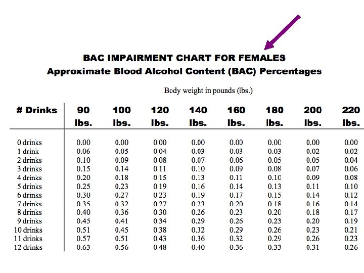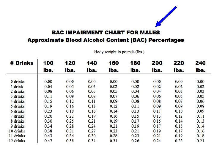 Blood Alcohol Concentration (BAC) *Amount of alcohol in the blood – BAC. 1= 1 part alcohol per 1, 000 parts blood – Depends on…gender, weight, food in stomach, how much you drink, how quickly you drink • What is the legal limit for driving for someone over 21? • What BAC becomes lethal?