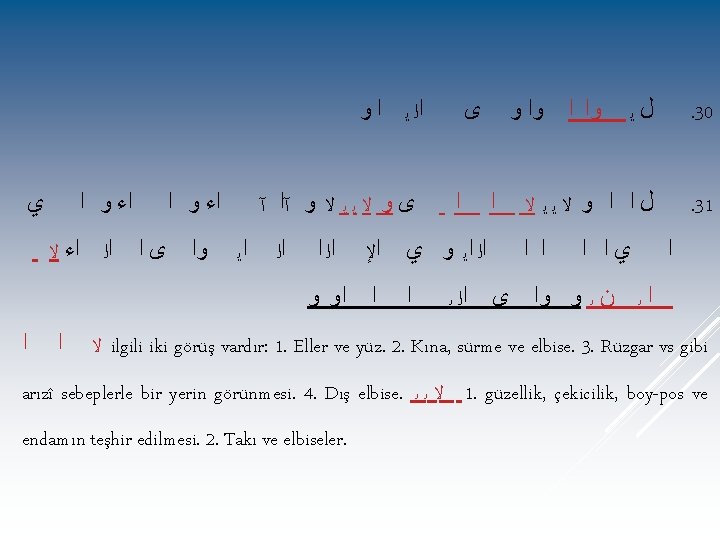 yette bahsedilen ) ﻟﻳ zînet), ister doğuştan olsun ister sonradan olsun insanı başkalarının gözünde süsleyen ve güzelleştiren şeylerdir. Buna göre daha çok kadınların taktıkları altın, gümüş, inci gibi süs eşyasına zînet denmekle beraber, özellikle kadının câzip yerlerine de zînet denebilir. yet i kerîmede zînet ile, takılan süs eşyasından çok, bu eşyanın takıldığı zînet yerleri kastedilir. Çünkü takılan zînetin gösterilmesi haram olmakla zînetin takıldığı yerin gösterilmesi de haram olur. (bk. Kurtubî, el-Câmi‘, XII, 153; İbn Kesîr, Tefsîru’l-Kur’ân, III, 283) İstisnâ edilen “mecbûren açılan” veya “görünmesinde sakınca olmayan” kısmını ashâb ı kirâmdan Hz. Ali, İbn Abbas, İbn Ömer, Enes, tabiîlerden Saîd b. Cübeyr, Atâ, Mücâhid, Dahhâk, müctehid imamlardan Ebû Hanîfe, Mâlik ve Evzâî’nin de dâhil olduğu İslâm âlimlerinin çoğunluğu “yüz ve bileklere kadar eller” olarak anlamışlardır. (bk. Taberî, Câmi‘u’l-beyân, XIII, 92 93) Diğer bir kısım sahabî, tabiîn, İmam Şâfi ve İmam Ahmed b. Hanbel’e göre kadının yüz ve ellerinin açılması da haramdır. Dolayısıyla açılmasına müsaade edilen dış zînet, âyet i kerîmede kullanılan )zahara) fiilinin özelliği gereği kendiliğinden açılan zînettir ki, bunun “eller ve yüz” olması mümkün değildir. Çünkü bunları kapatma imkânı vardır ve kendiliğinden açılması söz konusu değildir. Bu, kadının iradesi dışında rüzgar vs. ile açılan zîneti olmalıdır. Sözkonusu âyetle zînetin ikinci zikredilişinde bu istisnânın olmaması da bunu gösterir. Yahut da bu, zâten kapatma imkânı olmayan dış elbiseden ibarettir. (bk. Taberî, Câmi‘u’l-beyân, XIII, 92 93; Cessâs, Ahkâmu’l-Kur’ân, V, 172; Zemahşerî, el-Keşşâf, III, 186)