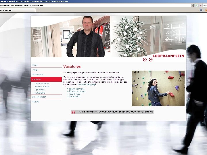 Tegen de stroom in… Investeren in mensen, juist in krappe tijden: § Opleiding & ontwikkeling § Medewerkertevredenheidsonderzoek § Arbeidsmarktcommunicatie § Jonge Talenten § Loopbaanplein