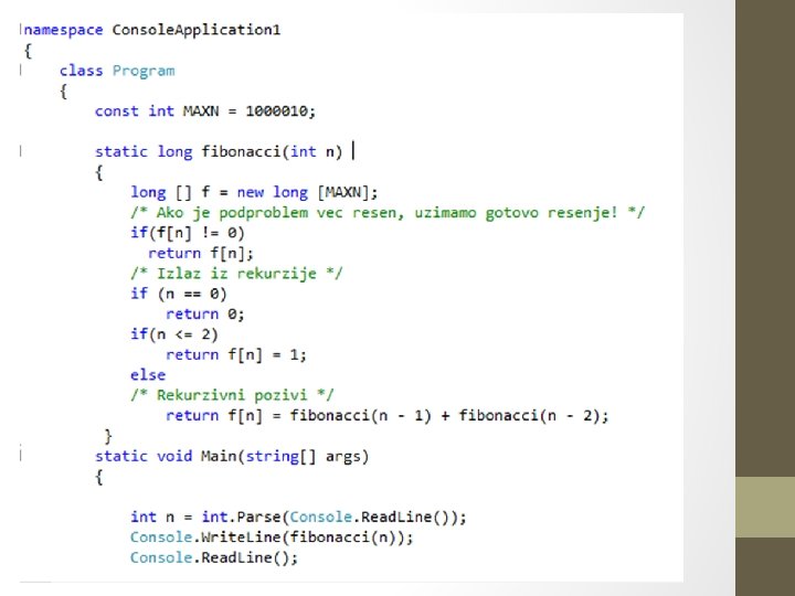 REKURZIVNO EFIKASNIJE REŠENJE SA MEMOIZACIJOM Analiza rešenja: U slučaju da se rekurzijom problem svodi na više manjih podproblema koji se mogu preklapati, postoji opasnost da se pojedini podproblemi manjih dimenzija rešavaju veći broj puta. Na primer, fibonacci(20) = fibonacci(19) + fibonacci(18) fibonacci(19) = fibonacci(18) + fibonacci(17) tj. problem fibonacci(18) se resava dva puta. Problemi manjih dimenzija će se rešavati još veći broj puta. Rešenje za ovaj problem je kombinacija rekurzije sa tzv. "dinamičkim programiranjem" tj. podproblemi se rešavaju samo jednom, a njihova rešenja se pamte u memoriji (obično u nizovima ili matricama), odakle se koriste ako tokom rešavanja ponovo budu potrebni.