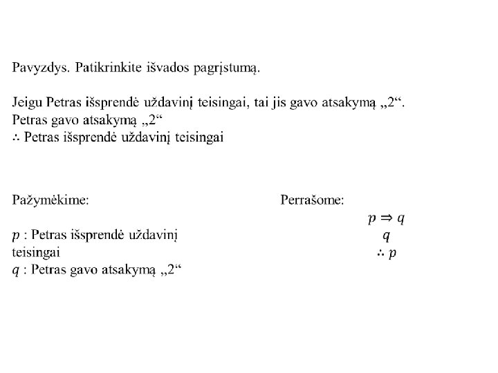 Patikrinkime išvados pagrįstumą. Jei vakar lijo, tai Jonas visą dieną žiūrėjo televizorių. Jei jis nežiūrėjo televizoriaus, tai nematė orų prognozės. Jei jis būtų matęs orų prognozę, tai šiandien užsidėtų kepurę. Žinoma, kad Jonas šiandien užsidėjo kepurę arba vakar visą dieną žiūrėjo televizorių. Taigi galime teigti, kad vakar lijo arba Jonas žiūrėjo orų prognozę.