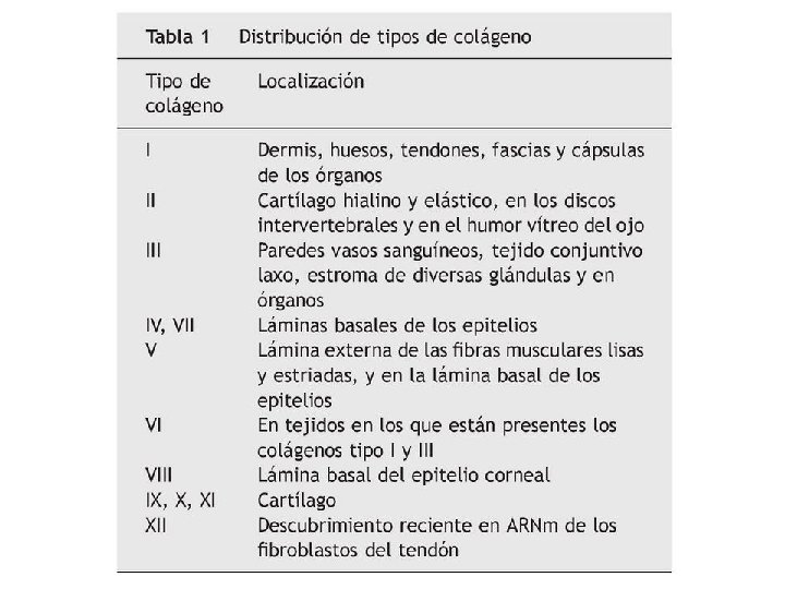 Fibras de colágeno • Al microscopio óptico son acidófilas. • Están constituidas por una glucoproteína estructural, denominada colágeno, constituida por aminoácidos (glicina, prolina, hidroxiprolina). • Es la proteína mas abundante en el cuerpo humano.
