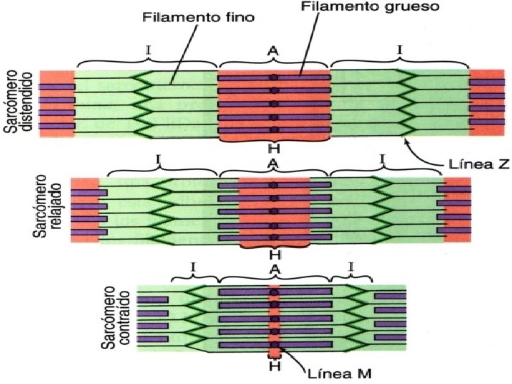 Sarcómero en contracción Durante la contracción la banda A no se modifica, pero las hemibandas I se acortan en forma proporcional al grado de contracción, por lo tanto los discos Z se acercan mutuamente. Este desplazamiento se debe a que las cabezas de las fibras de miosina II se deslizan sobre los filamentos de actina.