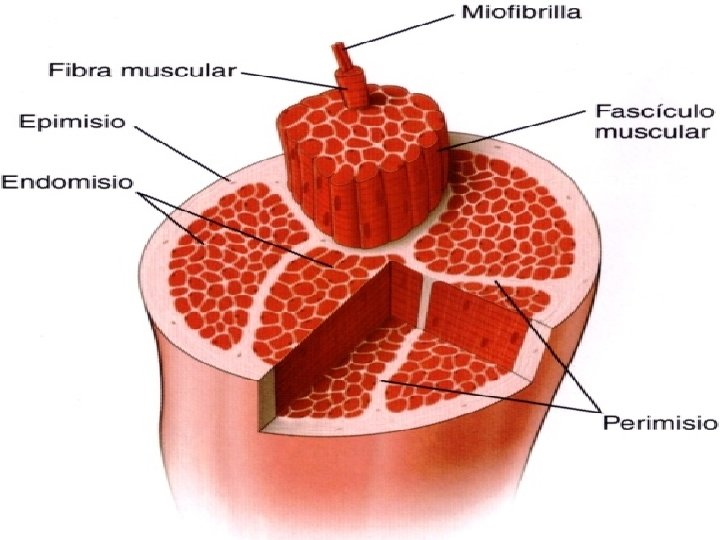 Las fibras musculares se encuentran rodeadas por tejido conectivo El endomisio es una capa de fibras reticulares junto con GAGs, es la lámina basal que junto con la membrana plasmática conforma el sarcolema. El perimisio es una capa más gruesa de tejido conectivo que rodea a un grupo de fibras para formar un fascículo o haz. El epimisio es una vaina de tejido conectivo denso que rodea al conjunto de fascículos que forman el músculo.