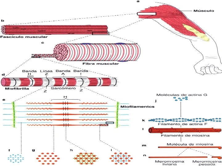 Tejido muscular La interacción de miofilamentos es la causa de la contracción de las células musculares, los miofilamentos son de dos tipos, unos son finos (actina) y otros son gruesos (miosina). A muchas estructuras en el tejido muscular se le agre- ga el prefijo sarco, ya que en griego sarcos significa carne. Así tendremos un sarcoplasma (citoplasma), sarcolema (lámina basal + membrana plasmática), retículo sarcoplasmático (retículo endoplasmático liso, REL) y sarcosoma (mitocondria).