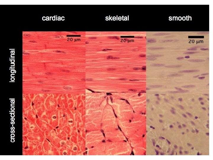 Corte longitudinal del tejido muscular liso. Fotografía al ME Corte transversal del tejido muscular liso. Esta disposición en capas perpendiculares es muy frecuente en el músculo liso. Así se asegura la capacidad de contracción en dos direcciones.