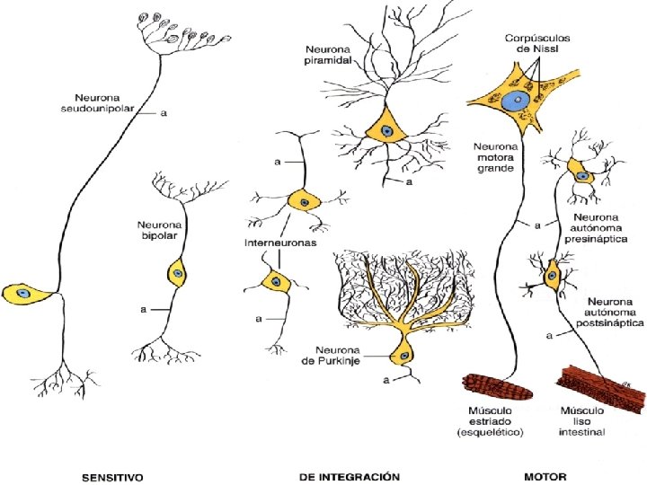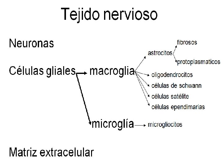 Tejido nervioso La célula nerviosa o neurona es la unidad funcional del tejido nervioso y está compuesta por un cuerpo celular o soma (que contiene el núcleo) y muchas prolongaciones de longitud variable. Las células de sostén, neuroglia o glía son células no conductoras que están en estrecha relación con las neuronas. Cumplen con varias funciones como dar sostén físico a las neuronas, aislar eléctricamente a los somas y las prolongaciones de neuronas y participar en mecanismos de intercambio metabólico