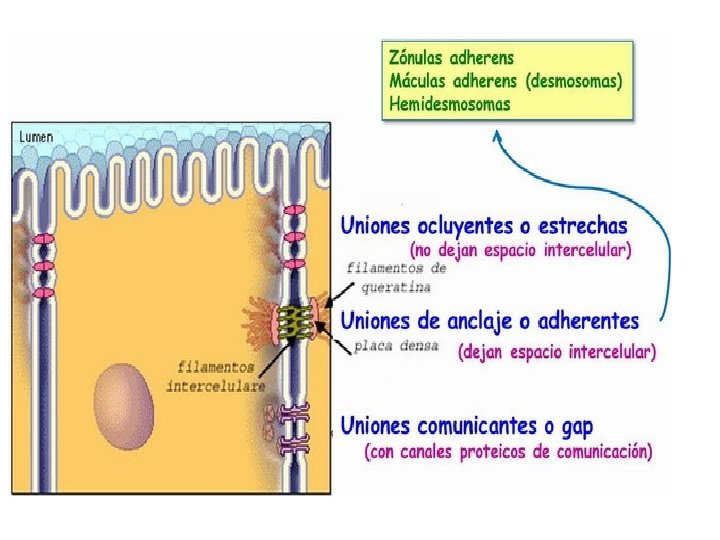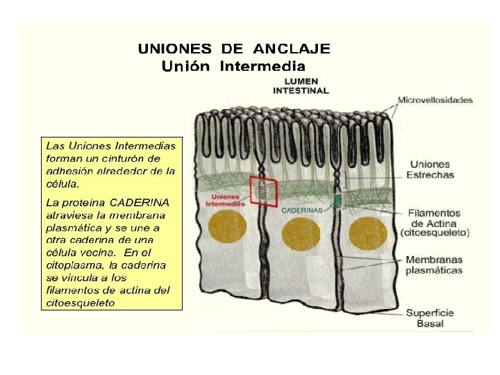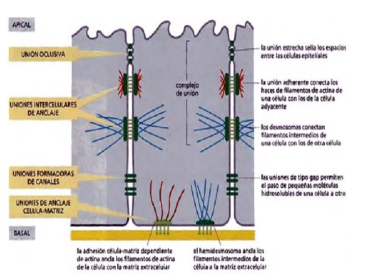 Unión de anclaje • Unión mecánica entre las células vecinas y del anclaje de las células a la matriz extracelular. • Función: resistencia al estiramiento, fuerzas mecánicas: están en músculo del corazón, útero , epidermis. • Los filamentos intermedios se unen a uniones llamadas desmosomas y hemidesmosomas.