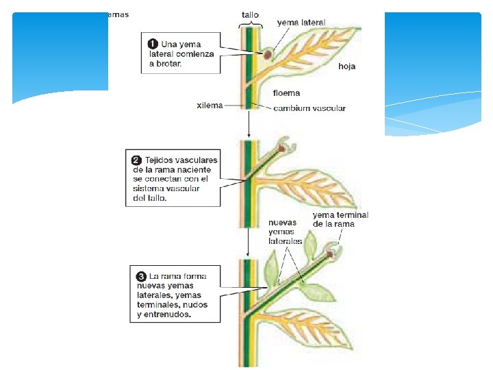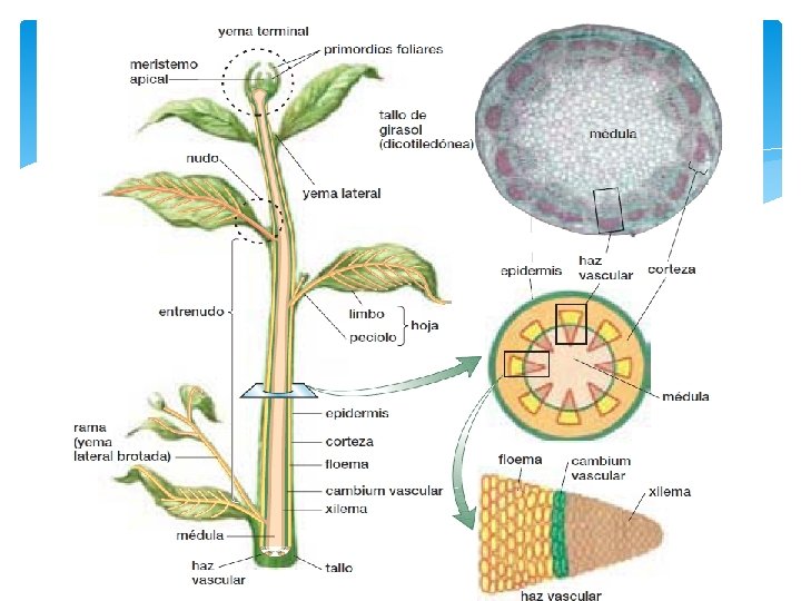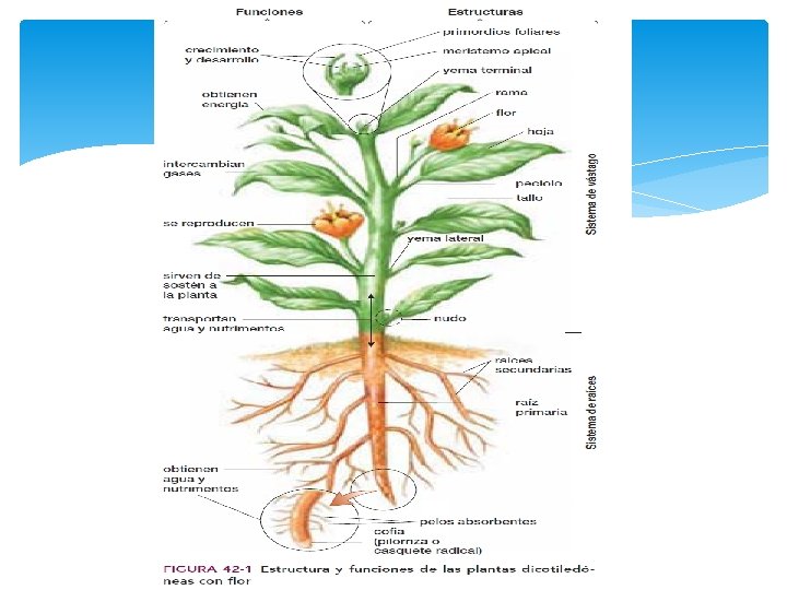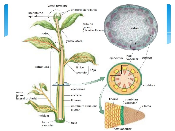 Tejidos meristemáticos: crecimiento Los tejidos primarios: se encuentran en las zonas apicales de la plantas como los brotes de ramas y las raíces. Son los responsables del crecimiento longitudinal de las plantas.
