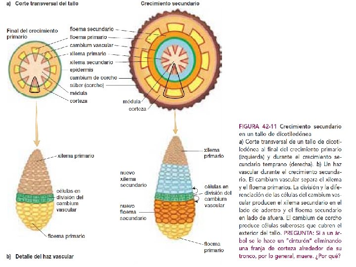 Tejidos meristemáticos: crecimiento Tejido secundario: se encuentran alrededor del tallo y son responsables del crecimiento secundario de las plantas, es decir, de su aumento en grosor de tallos y hojas. Estos proceden de células adultas que recobran la capacidad de dar origen a otras clases de tejidos. Existen dos tipos: el cambium, que origina los tejidos conductores y el felógeno, que da origen a una corteza protectora, el súber o corcho.