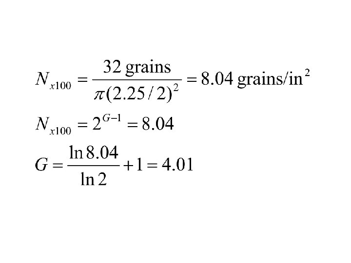 • Assume that there are 32 grains appeared on the microscope ocular which was set to x 100 magnification. The total circular area that this observation was performed has an diameter of 2. 25 inch. What would be the ASTM grain size of this material?