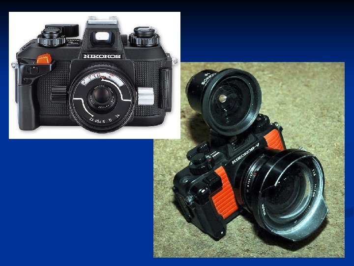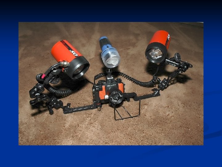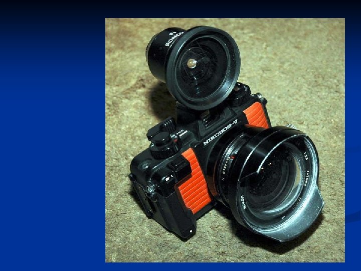 Masalah Cahaya dlm Gambar Warna alami di laut dominan biru, hijau dan coklat karena: perbedaan panjang gelombang --- Perbedaan penetrasi kedalam air : biru-hijau di laut terbuka dan kuning-hijau di perairan tawar n Pengambilan foto/video pada keadaan (cahaya) alami ---- membosankan. n Solusi: menggunakan cahaya buatan (blizt, strobe/lampu sorot) n