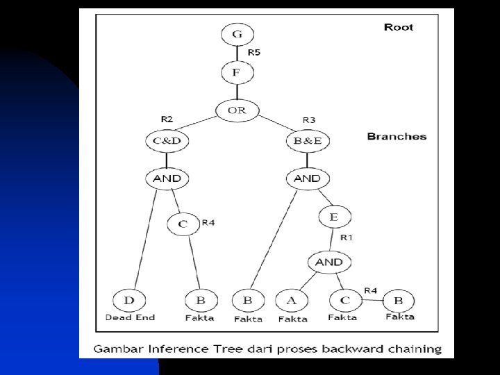 n n n BACKWARD CHAINING Pendekatan goal-driven, dimulai dari ekspektasi apa yang diinginkan terjadi (hipotesis), kemudian mengecek pada sebab-sebab yang mendukung (ataupun kontradiktif) dari ekspektasi tersebut. Jika suatu aplikasi menghasilkan tree yang sempit dan cukup dalam, maka gunakan backward chaining. Beberapa sifat dari backward chaining: u u u u Good for Diagnosis. Looks from present to past. Works from consequent to antecedent. Is goal-driven, top-down reasoning. Works backward to find facts that support the hypothesis. It facilitates a depth-first search. The consequents determine the search. It does facilitate explanation.