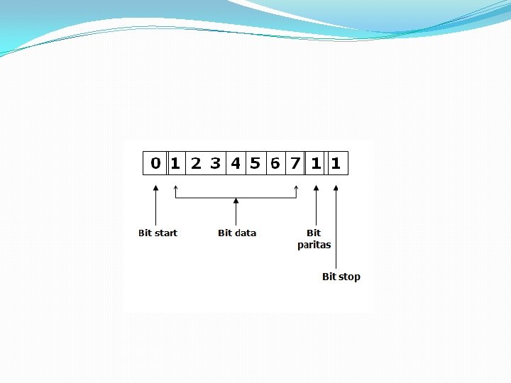 �Pada transmisi Asinkron, sebelum terjadi komunikasi, tdk diadakan sinkronisasi clock antara pengirim dan penerima �Data dikirim per karakter dan masing - masing karakter memiliki bit start (biasanya 0) dan bit stop (biasanya 1) �Start bit berfungsi utk menandakan adanya rangkaian bit karakter yang siap dikirim. �Stop bit berfungsi utk melakukan proses menunggu karakter berikutnya �Setiap karakter terdiri dari 10 bit dengan rincian : � 1 bit start bit � 1 bit stop bit � 7 bit data � 1 bit paritas
