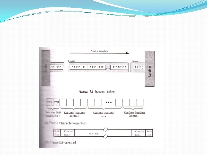 Transmisi Sinkron Transmisi sinkron adalah transmisi data dimana kedua pihak, pengirim dan penerima, berada pada waktu yang sinkron, biasanya dimulai dengan sinyal SYN untuk melakukan sinkronisasi antara dua piranti yang berkomunikasi, kemudian menyusul sinyal STX (startof-text) yang menyatakan awal dari transmisi data, kemudian sejumlah (blok) data dikirim, dan ditutup dengan ETX (end-of-text), terakhir ada sinyal BCC (block-check-character) yang digunakan untuk mengecek kesalahan dalam penerimaan data.