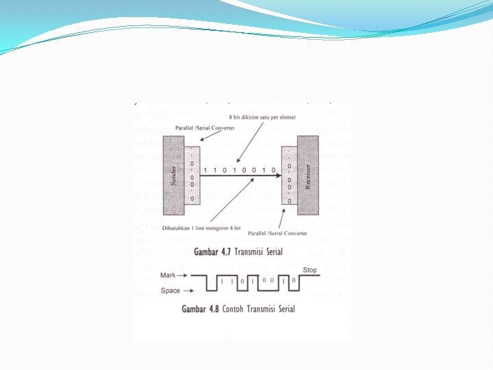 Transmisi Seri �Suatu pengiriman data disebut serial, jika sekelompok bit data ditransmisikan secara berurutan (serial / bit demi bit) dgn melewati satu jalur transmister dan satu jalur receiver �Sebelum dikirimkan, data dikonversikan dari paralel ke serial (enkapsulasi ) �Sistem ini digunakan untuk transmisi data yang memiliki jarak jauh �Setiap komputer diperlengkapi dengan saluran serial atau serial-port (RS-232 C, Kabel serial RS-232 yang digunakan untuk menghubungkan periferal (perangkat tambahan ) dengan komputer pribadi), yaitu saluran yang bisa menerima / mengirim data secara serial.