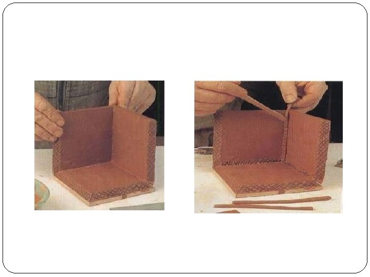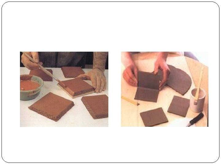 Pembuatan lempengan menggunakan bow harp Pembuatan lempengan dari tanah liat plastis yang dibentuk balok persegi panjang kemudian dipotong menggunakanbow harp. Potongan ini sesuai acuan ketebalan ukuran pada tangkai bow harp.