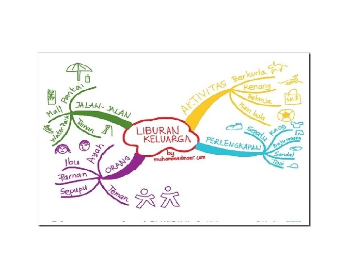 Langkah – langkah membuat Peta Pikiran 1. Tulis gagasan utamanya ditengah – tengah kertas dan lingkupilah dengan lingkaran, persegi, atau bentuk lain. 2. Tambahkan sebuah cabang yang keluar dari pusatnya untuk setiap poin atau gagasan utama. . Gunakan warna yang berbeda untuk tiap cabang. 3. Tulislah kata kunci atau frase pada tiap – tiap cabang yang dikembangkan untuk detail. 4. Tambahkan symbol – symbol dan ilustrasi – ilustrasi untuk mendapatkan ingatan yang lebih baik