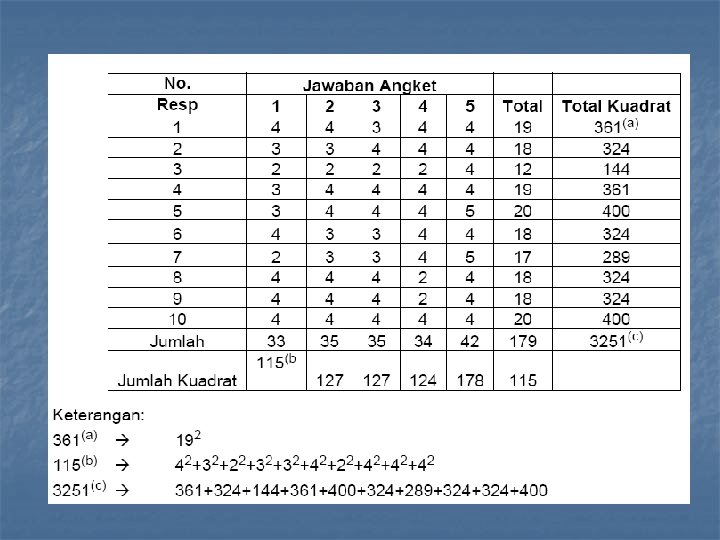 n Variansi butir ke-2 sampai ke-5 dapat dihitung dengan cara yang sama seperti menghitung variansi butir I sehingga total variansi butir : b 2 = 0, 61 + 0, 45 + 0, 84 + 0, 16 = 2, 51