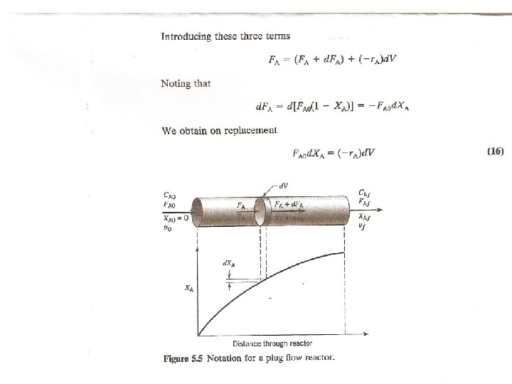 Steady state plug flow reactor Di dalam plug flow reactor komposisi dari fluida berubah dari titik ke titik sepanjang aliran. Persamaan NM untuk komp A disusun berdasarkan : A yang masuk : FA mole/waktu A yang keluar : FA + d. FA mole/waktu A yang berkurang krn bereaksi : (-r. A)d. V