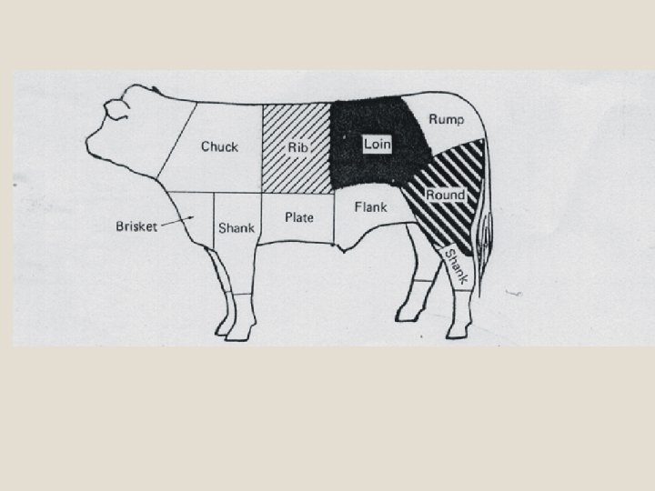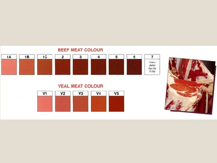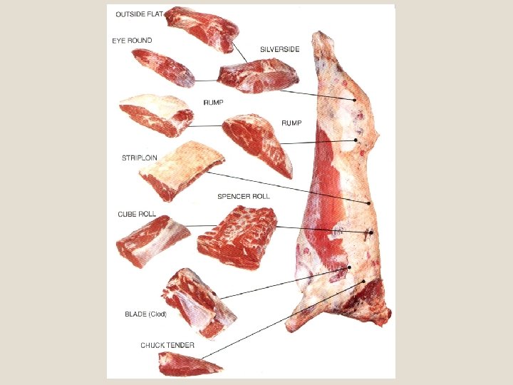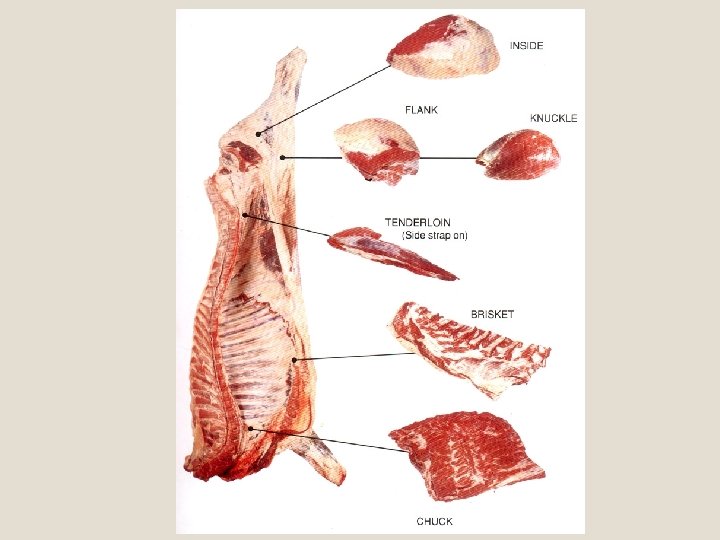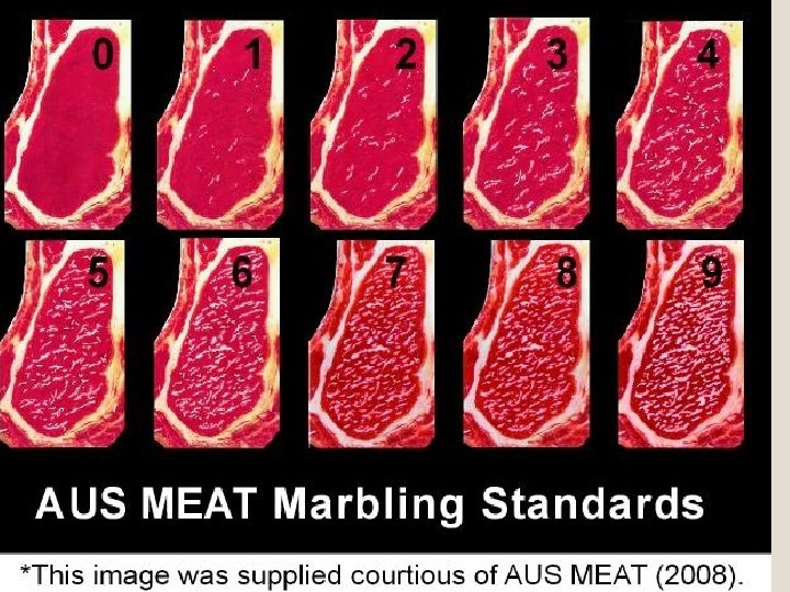 MARBLING • Gambaran lemak diantara serat-serat daging • Marbling terbaik pada ternak gemuk umur 2 -3 tahun (sapi); 10 -12 bulan (domba) ; 8 -10 bulan (babi) • Menentukan kualitas daging • Menentukan juicy & flavor