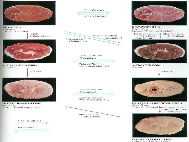 WARNA • Umur Myoglobin Warna lebih tua Sapi muda : 1 -4 mg/g daging Umur 2 tahun : 4 -10 mg/g Umur 12 tahun : 10 -18 mg/g • Spesies Babi : 1, 5 – 4 mg/g daging • Aktivitas Hewan kerja keras : Myoglobin • Sex Jantan > betina
