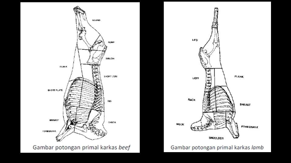 Pemotongan karkas • Dalam perdagangan internasional, pemotongan karkas biasanya mengikuti suatu aturan tertentu dan bagian-bagian potongannya juga memiliki nama-nama tertentu. • Sebagian produsen menjual dalam bentuk karkas utuh, sebagian lagi dalam bentuk potongan setengah, seperempat dan retail cut. • Potongan karkas setengah ditentukan dengan cara membelah karkas menjadi dua bagian sama besar, yaitu dari tengah-tengah tulang belakang dari leher hingga ekor. • Bila potongan karkas setengah ini dibagi dua melalui tulang rusuk ke 12 dan ke-13 maka masing-masing potongannya disebut dengan karkas seperempat (quarter).