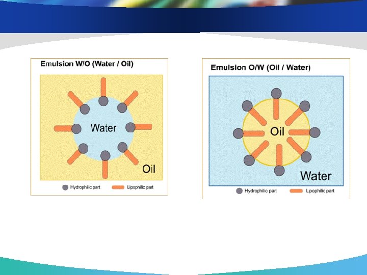 Tipe Emulsi a. Tipe minyak dalam air atau oil in water (o/w) Contoh : • susu • santan • lateks • lotion • mayonaise • salad dressing • es krim • cat b. Tipe air dalam minyak atau water in oil (w/o) Contoh : • mentega • margarin • shortening • lipstik • cream • coklat batangan • selai kacang • sabun padat • semir