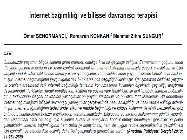• Johansson ve ark. 2004 • Norveç • İnternet Bağımlılığı Tanı Anketi (Diagnostic Questionnaire for Internet Addiction, YDQ) • İnternet kullanan ve kullanmayan 12 -18 yaş arasındaki 3237 ergen • Morahan-Martin ve ark. 2000 • ABD • Daha önce internet • Patolojik İnternet Kullanımı kullanmayan altı katılımcının Ölçeği (Pathological Internet bulunduğu 277 kolej Use Scale, PIUS) öğrencisi • Tsai ve ark. 2009 • Tayvan • Gözden Geçirilmiş Çin İnternet Bağımlılığı Ölçeği (Chinese Internet Addiction Scale-Revision, CIAS-R) • 4710 üniversite ilk sınıf öğrencisi • % 1. 98 • % 8. 1 • % 17. 9