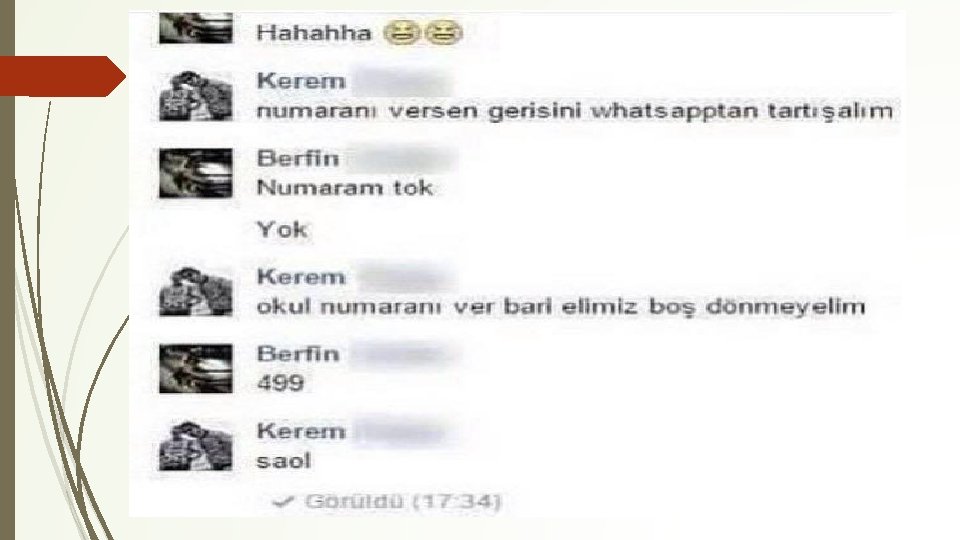 Paylaşımlardaki riskler Paylaşmak güzeldir. Fakat her bilgi herkesle paylaşılmamalı! Paylaştığınız her türlü bilgi silinmeden kalabilir Kolaylıkla gönderebilirsiniz ancak, geri alamazsınız Gönderileriniz masum görünse de, sonradan hayatınızı etkileyebilir Günlük hayatınızı, arkadaşlarınız ve öğretmenlerinizle olan ilişkilerinizi etkileyebilir Keşke paylaşmasaydım demenize sebep olabilir