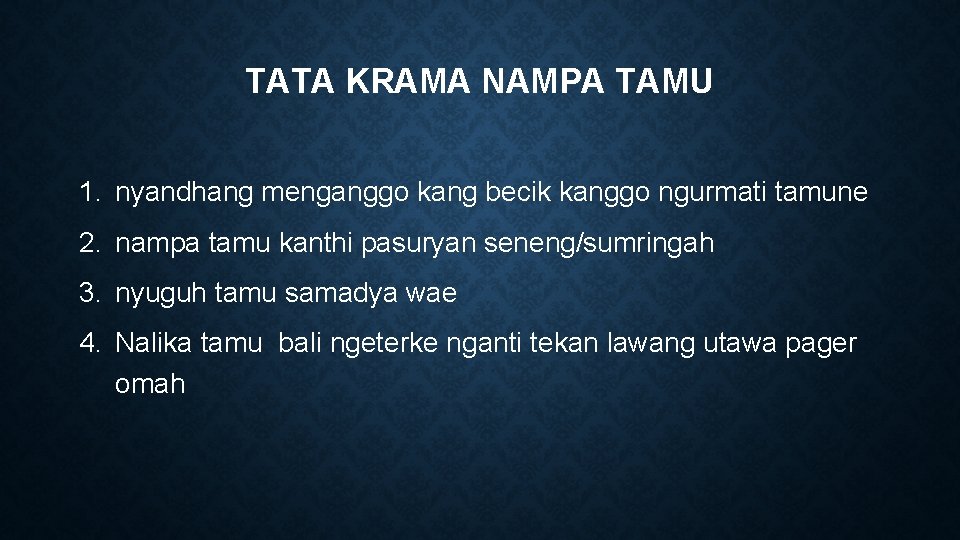 TATA KRAMA NAMPA TAMU 1. nyandhang menganggo kang becik kanggo ngurmati tamune 2. nampa tamu kanthi pasuryan seneng/sumringah 3. nyuguh tamu samadya wae 4. Nalika tamu bali ngeterke nganti tekan lawang utawa pager omah