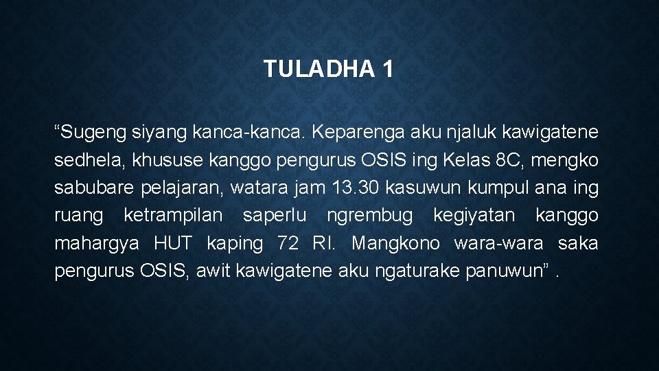 TULADHA 1 “Sugeng siyang kanca-kanca. Keparenga aku njaluk kawigatene sedhela, khususe kanggo pengurus OSIS ing Kelas 8 C, mengko sabubare pelajaran, watara jam 13. 30 kasuwun kumpul ana ing ruang ketrampilan saperlu ngrembug kegiyatan kanggo mahargya HUT kaping 72 RI. Mangkono wara-wara saka pengurus OSIS, awit kawigatene aku ngaturake panuwun”.