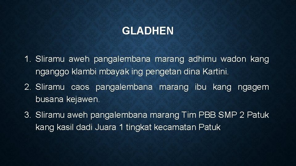 GLADHEN 1. Sliramu aweh pangalembana marang adhimu wadon kang nganggo klambi mbayak ing pengetan dina Kartini. 2. Sliramu caos pangalembana marang ibu kang ngagem busana kejawen. 3. Sliramu aweh pangalembana marang Tim PBB SMP 2 Patuk kang kasil dadi Juara 1 tingkat kecamatan Patuk