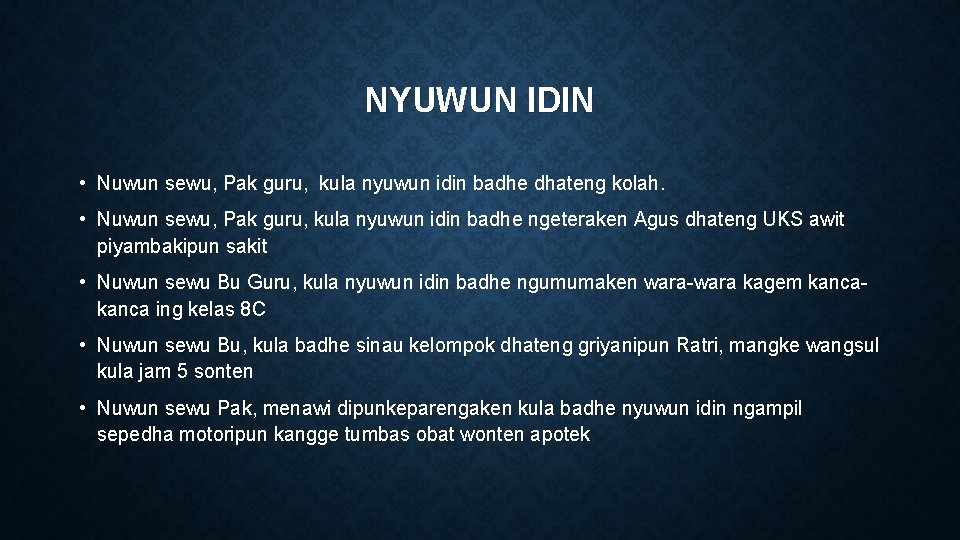 NYUWUN IDIN • Nuwun sewu, Pak guru, kula nyuwun idin badhe dhateng kolah. • Nuwun sewu, Pak guru, kula nyuwun idin badhe ngeteraken Agus dhateng UKS awit piyambakipun sakit • Nuwun sewu Bu Guru, kula nyuwun idin badhe ngumumaken wara-wara kagem kanca ing kelas 8 C • Nuwun sewu Bu, kula badhe sinau kelompok dhateng griyanipun Ratri, mangke wangsul kula jam 5 sonten • Nuwun sewu Pak, menawi dipunkeparengaken kula badhe nyuwun idin ngampil sepedha motoripun kangge tumbas obat wonten apotek