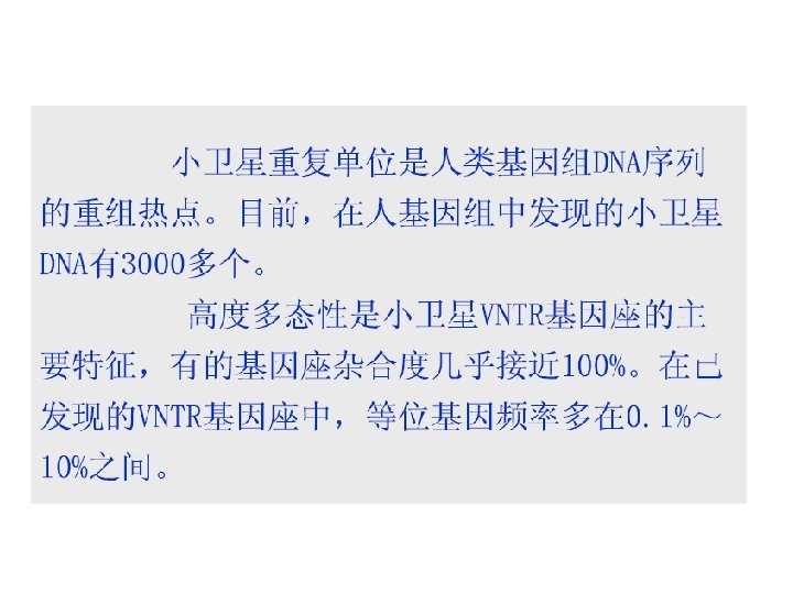 可变数目串联重复序列 Variable number tandem repeats, VNTRs 小卫星DNA (ministatellite DNA) 重复单位长度 15 -30 bp, 序列总长度约 100 bp-20 kb 基因座A(VNTR) 基因座B(STR) 微卫星DNA (microstatellite DNA) Repeat unit length 2 -6 bp, Repeat the number 10 to 60 times,Sequence length under 400 bp,又称短串联重 复序列(short tandem repeats, STRs)