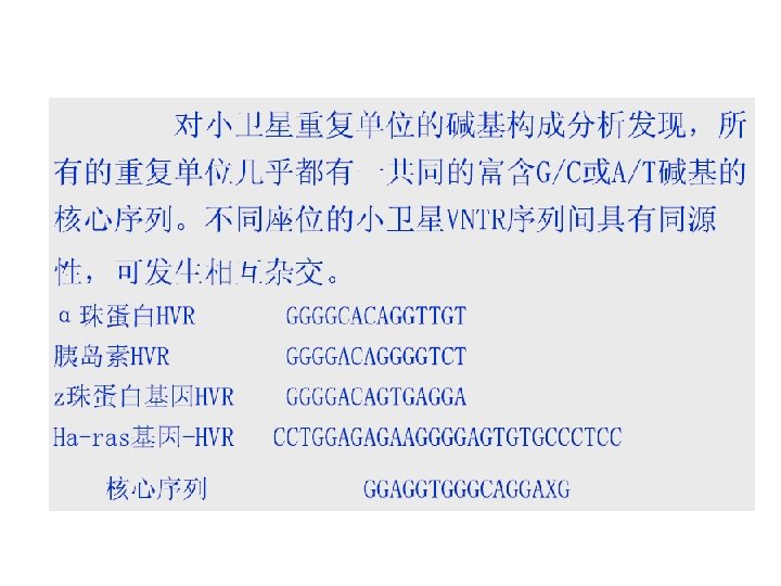 (一)VNTR The sequence Consist of a short, base relatively conservative sequence as a repeating unit, Specific location in the genome tandem repeats, the formation of a sequence. 小卫星序列 (ministatellite sequence) Repeat unit length 6 -70 bp, 基因座A(VNTR) After several repetitions hundreds of times. About 100 bp sequence length - 20 KB