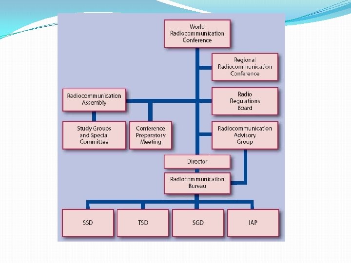 Sector de Radiocomunicaciones � El espectro radioeléctrico, recursos limitados con gran demanda y las órbitas de los satélites entran en este sector. Uno de los principales intereses es el servicio de redes de satélites de alta velocidad y su regulación. Hoy día el cambio climático es un tema que cobra importancia en las radiocomunicaciones. � El principal objetivo es garantizar el funcionamiento sin interferencias de los sistemas de radiocomunicaciones, lo que se logra mediante la aplicación del Reglamento de Radiocomunicaciones y los Acuerdos Regionales, y mediante la debida y puntual actualización de estos instrumentos a través de los procesos de las Conferencias Mundiales y Regionales de Radiocomunicaciones. Además, para la normalización del sector se crean “Recomendaciones” cuyo objetivo es garantizar la necesaria calidad y eficacia del funcionamiento de los sistemas de radiocomunicaciones. Asimismo se estudian los modos y maneras de conservar el espectro y asegurarse de que se deja margen para futuras ampliaciones y nuevos desarrollos tecnológicos.