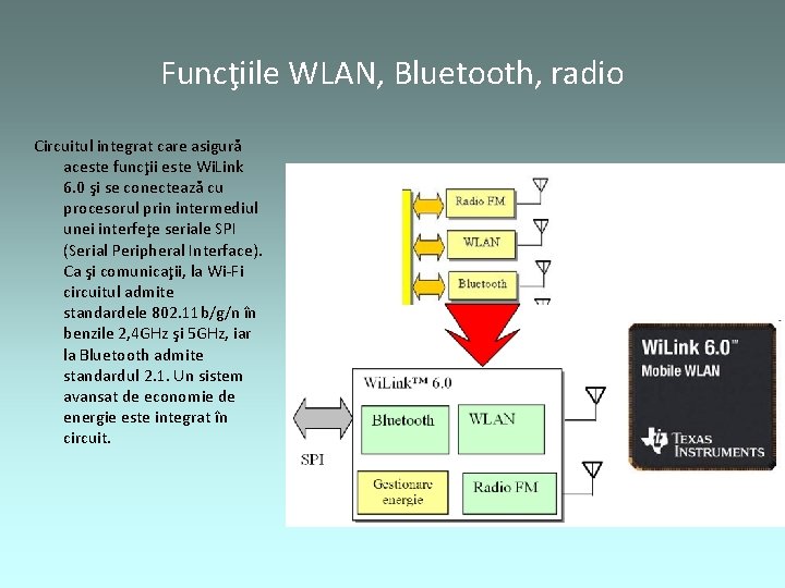 Funcţiile WLAN, Bluetooth, radio Circuitul integrat care asigură aceste funcţii este Wi. Link 6. 0 şi se conectează cu procesorul prin intermediul unei interfeţe seriale SPI (Serial Peripheral Interface). Ca şi comunicaţii, la Wi-Fi circuitul admite standardele 802. 11 b/g/n în benzile 2, 4 GHz şi 5 GHz, iar la Bluetooth admite standardul 2. 1. Un sistem avansat de economie de energie este integrat în circuit.