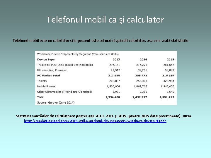 Telefonul mobil ca şi calculator Telefonul mobil este un calculator şi în prezent este cel mai răspândit calculator, aşa cum arată statisticile Statistica vânzărilor de calculatoare pentru anii 2013, 2014 şi 2015 (pentru 2015 date previzionate), sursa http: //marketingland. com/2015 -will-4 -android-devices-every-windows-device-90227