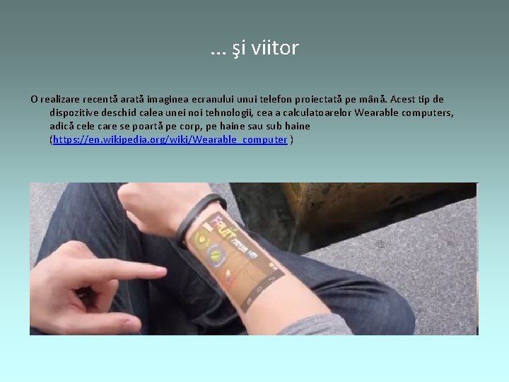 . . . şi viitor O realizare recentă arată imaginea ecranului unui telefon proiectată pe mână. Acest tip de dispozitive deschid calea unei noi tehnologii, cea a calculatoarelor Wearable computers, adică cele care se poartă pe corp, pe haine sau sub haine (https: //en. wikipedia. org/wiki/Wearable_computer )