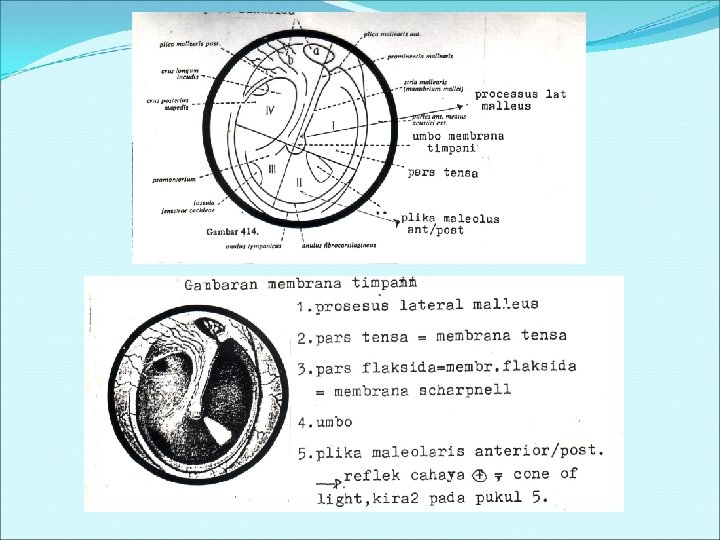 3. Membrana Tympani v Menutupi ujung bagian dalam liang telinga v Menjadi dinding lateral telinga tengah v Tdd 3 lapisan : q q q Kulit, lanjutan epidermis liang telinga (epitel berlapis gepeng) Serat kolagen dan elastis berjalan radier dan sirkuler Lanjutan mukosa dan kavum tympani (epitel berlapis kubus)