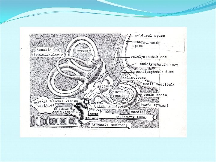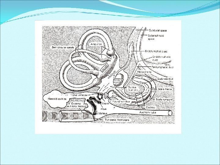 Telinga dalam Tdd atas : 1. Labirin tulang 2. Labirin membranaseus Labirin Tulang : v v v Dinding tulang Isi perilimph Didalamnya mengapung labirin membranaseus Dilapisi epitel selapis gepeng Tdd : koklea, Vestibulum, Kanalis semisirkularis