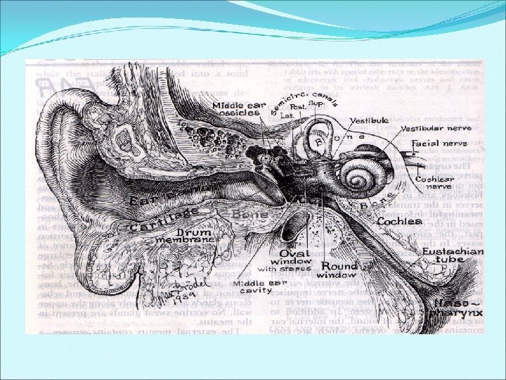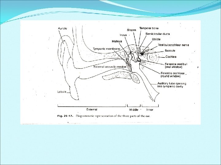 Telinga Terdiri dari 3 bagian : 1. Telinga Luar tdd: v v v Auricula Meatus Akustikus Eksterna Membrana tympani 2. Telinga Tengah v v v Cavum tympani Tuba Eustachius Tulang 2 pendengaran : Malleus, Incus, Stapes 3. Telinga Dalam, disebut Labirin : v v Labirin tulang (Osseus) Labirin mebranaseus