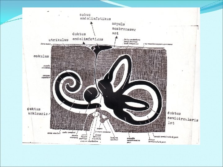 Labirin Membranaseus : v v v Terletak dalam labirin tulang Dinding membran Bentuk identik dgn labirin tulang, tapi lebih kecil dan terpisah oleh cairan perilimph Isinya endolimph Tdd : duktus koklearis, utrikulus dan sakulus, dan duktus semisirkularis