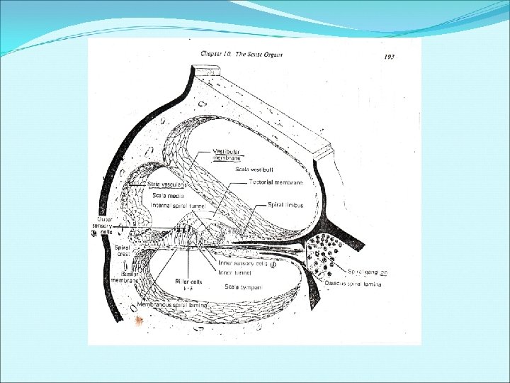 Skala Media (Duktus Koklearis= labirin membranaseus koklea) Batas 2 : v. Atas , membrana Vestibularis (Reissner) v. Lateral , ligamentum spirale, strie vaskularis yg mhasilkan endolimph v. Bawah , membrana basilaris, dari jaringan ikat mengalami modifikasi menjadi limbus spirale, pada limbus melekat membran tektoria