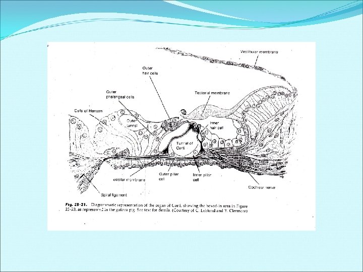 Organ corti Suatu struktur epitel mengisi duktus koklearis Terletak diatas membran basilaris Dibentuk oleh sel pilar (tongkat) Fungsi : reseptor getaran yg diinduksi oleh gelombang suara Bagian luar dan dalam ada sel rambut yaitu : sel rambut luar tdd 1 baris, sel rambut dalam tdd 3 -4 baris Serabut saraf (n. auditorius) berhubungan dgn sel rambut ini Ada struktur terapung pada endolimph disebut membrana tektoria, yaitu mulai dari lamina spiralis dekat membrana Reissner