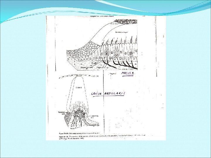 Alat keseimbangan Makula, makula utrikuli berbentuk lonjong, makula sakuli berbentuk jantung Tdd: Sel penunjang v Sel sensoris v Mempunyai Statokonia (hablur kecil 2), yg tdd Ca. CO 3 + protein, disebut batu keseimbangan (Statokonium) v Krista ampularis, tdp didalam ampula dan identik dgn makula, tp tdk memp. Statokonia. Membrana gelatinosanya disebut Kupula