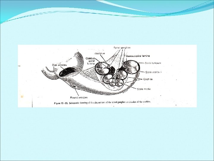 Koklea v. Mengandung alat pendengaran v. Bentuk seperti siput dgn 2, 5 lingkaran v. Sumbu tengah disebut modiolus v. Pada apek tdp lobang kecil disebut Helikotrema v. Tdd 2 ruangan : Skala Vestibuli (bagian atas) § Skala Tympani (bagian bawah) Didalam skala vestibuli akan mengapung ruangan Skala Media (labirin membranaseus) yang berisi cairan endolimph. §